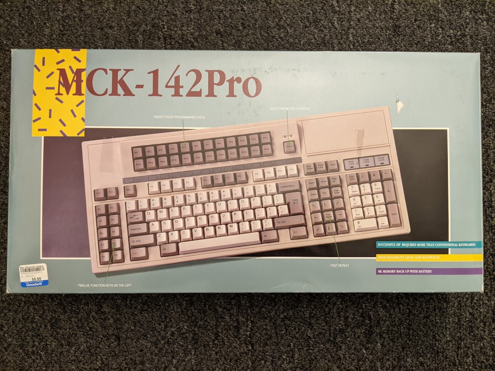 Our tale begins in December of 2020 with a message from my friend, roommate, and a notorious thrifter/dumpster diver extraordinaire, Jorge (name changed to protect the innocent) asking if I was interested in an old mechanical keyboard from the thrift store, still in the original packaging. The message came with a picture of the front of the box, from which little information could be gleaned except the words “TWENTY-FOUR PROGRAMMABLE KEYS”. Like any good computer nerd, I said “Absolutely!”. So he picked up two, one for himself and one for me, for a crisp $3 USD each.